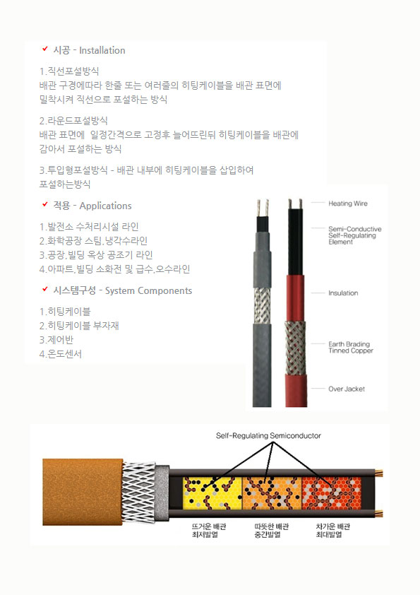 자율제어 히팅케이블 Self Regulating Heating Cable 관련링크 목록 본문 외부온도 변화에따라 스스로 발열량을 조절하는 자율제어형 히팅케이블병렬구조이며 길이에 상관없이 단위 m당 발열량이 일정한 특성을 가진 구조입니다.자율제어 히팅케이블이라고도 하며 주로 배관동파방지 또는 온도유지용으로 사용됩니다. 다음